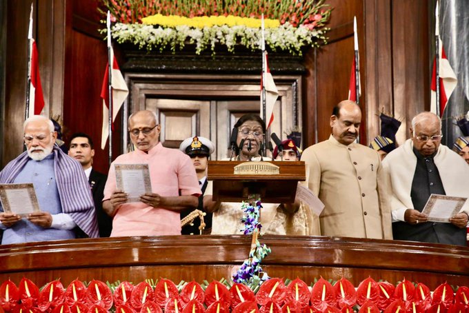 President of India, Smt. Droupadi Murmu, addressed Members of both Houses of Parliament in the Central Hall of Samvidhan Sadan today, as the nation celebrated the 11th Samvidhan Divas with great fervour and enthusiasm. Vice-President of India and Chairman, Rajya Sabha, Shri C. P. Radhakrishnan also addressed on the occasion. The event was graced by Prime Minister, Shri Narendra Modi; Lok Sabha Speaker Shri Om Birla, Union Ministers, Leader of Opposition in Rajya Sabha, Shri Mallikarjun Kharge; Leader of Opposition in Lok Sabha, Shri Rahul Gandhi; Deputy Chairman, Rajya Sabha, Shri Harivansh and Members of Parliament.